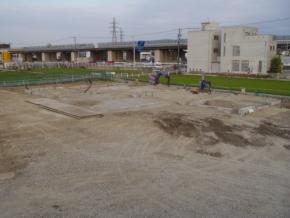 土間下の地盤改良工事が完了し、埋戻し・埋設配管工事中です。