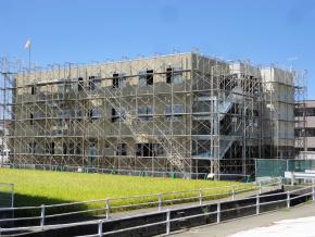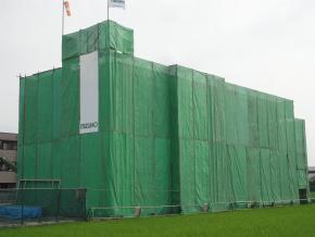 外観です。足場シートを張り、これから外壁廻りの工事に着手していきます。