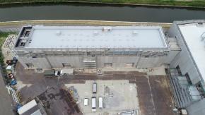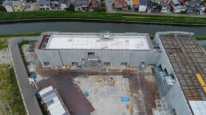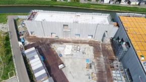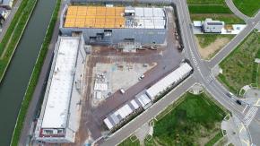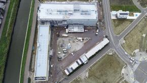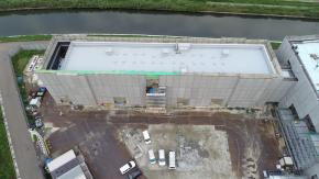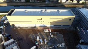 朝日に浮かぶ倉庫棟です。