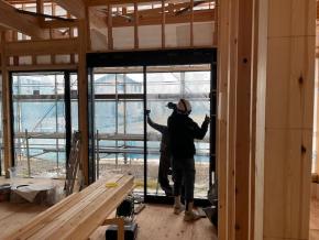 サッシ取付作業中です。