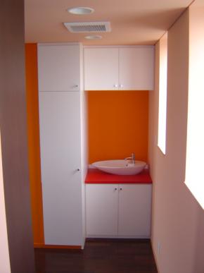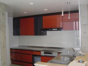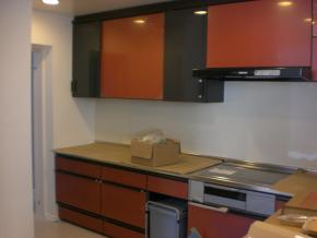 キッチンは朱色でコンクリート打放しの中でアクセントになっております。