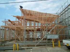 本日、建方中です。天候にも恵まれ、夕方には屋根下地まで完了する予定です。