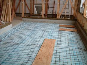 内部待合室の床暖房の配管中です。待合室は天井も高いため、補助的な暖房として温水式の床暖房が設置されます。