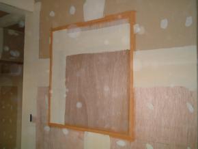 1F待合室のクロスのパテ処理中です。