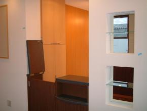 エステ待合室の棚取付も完了しました。こちらは背板をガラスにし、上部にはダウンライトを入れて化粧品を陳列出来るように配慮しております。