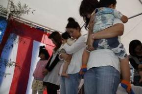 今回の「子育てママ応援プロジェクト」のメンバーであるママさん達も地鎮祭に参加。神妙な面持ちでお祓いを受けています。