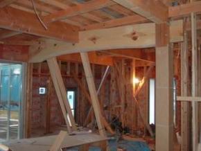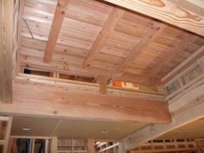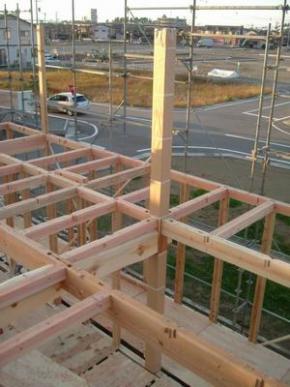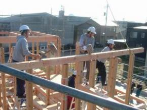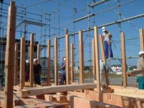大工さんが力を合わせて2階の梁を架け、柱を建てて行きます。