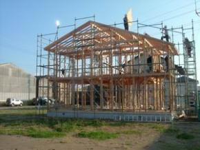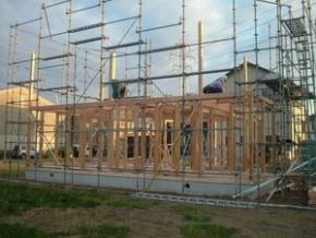 自慢の基礎に土台となる木が取り付けられて、ついに建物の柱が建ちます。上棟です。