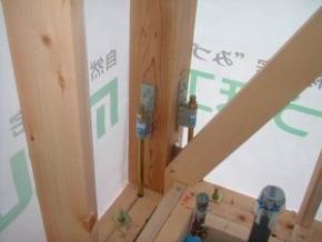 上棟が終わると次は柱や梁を頑丈な金物で固定して行きます。写真は通し柱の専用金物。