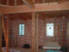 余談ですが奥に見えるシートは湿気を逃がしながら防水する透湿防水シート。各メーカーが社名を入れてアピールする部材です。