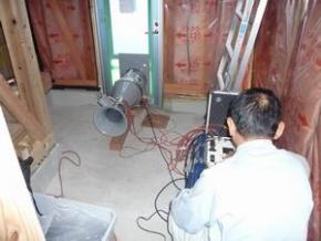 気密測定は住宅内を密閉し空気を排出する機器で、住宅に開いた穴 ( 隙間 ) がどれくらいあるかを測定します。写真中央にある機器が空気を排出しています。