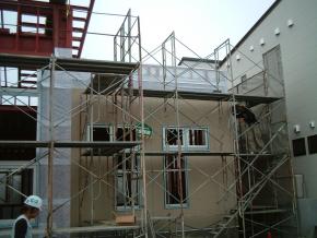 外壁サイディング貼り中です。グレーの外壁部分はガルバニウム鋼板の外壁の下地になります。