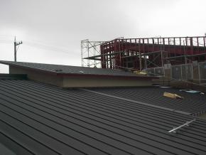 現在屋根工事中です。折半屋根部分はほぼ完了しましたが、ガルバニウム鋼板部分の屋根工事中です。
