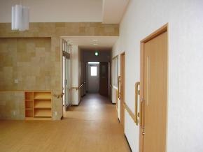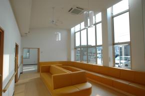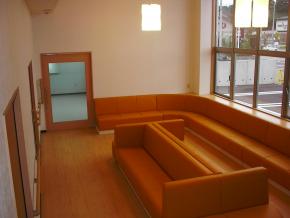 受付前から待合室側を写した写真です。写真左側は診察室、処置室の入り口で正面がリハビリ室の入り口になります。