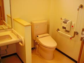 女子トイレになります。ゆったりとしたスペースが確保され、車椅子の方でも使いやすいトイレになっております。