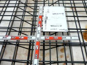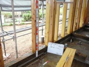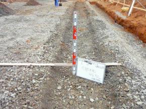 建物の基礎の下、捨てコンクリート打設用、採石敷き均し、厚み150o確認を行いました。