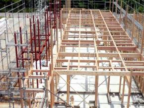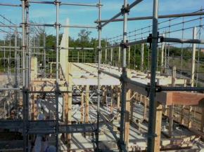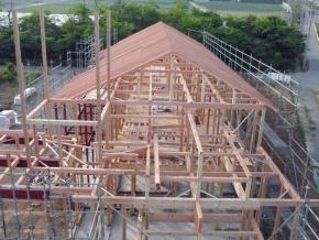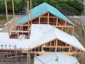 台風養生の為、外部足場のメッシュシートを外しました。外壁サイディングを張る前の建物全容が見えます。