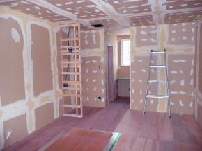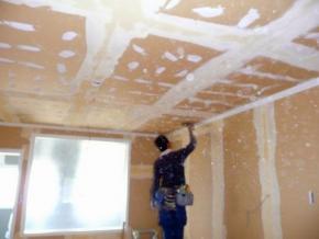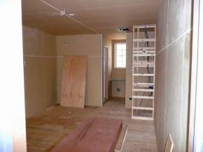 部屋内部のプラスターボード張りが、ほぼ完了いたしました。